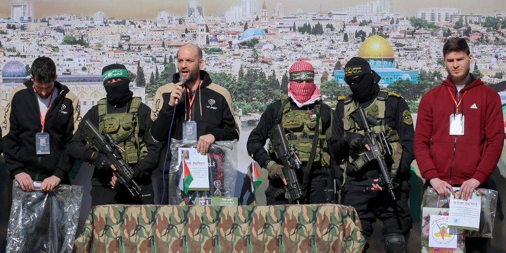 हमासका नकाबधारी लडाकूहरूले गाजाको दक्षिणी शहर खान युनिसको एक मञ्चमा बन्धकहरूलाई परेड गराएपछि उनीहरूलाई रेडक्रसलाई हस्तान्तरण गर्नुअघि भीडलाई सम्बोधन गर्न भनिएको थियो।
