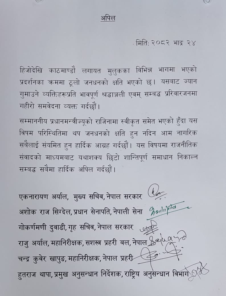 साझा अपिलमा मुख्य सचिव एकनारायण अर्याल, प्रधान सेनापति अशोकराज सिँदेल, गृहसचिव गोकर्णमणि डुवाडी, सशस्त्र प्रहरी बलका महानिरीक्षक राजु अर्याल, नेपाल प्रहरीका महानिरीक्षक चन्द्रकुवेर खापुङ र राष्ट्रिय अनुसन्धान विभागका महानिर्देशक हुतराज थापाको हस्ताक्षर रहेको छ ।